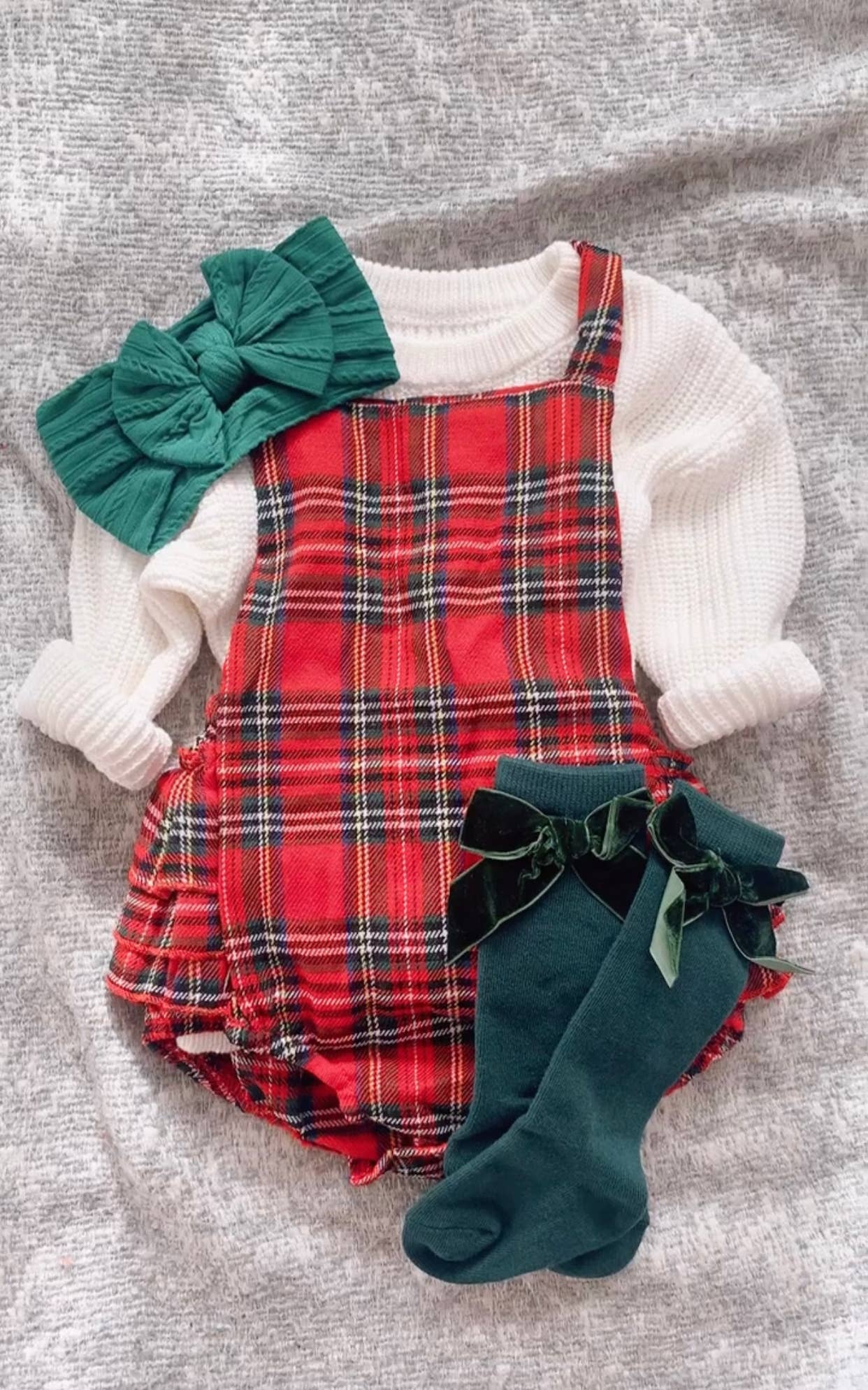 Christmas is just around the corner and this beautiful plaid suspender romper is a must have for style and comfort. This romper makes an easy dressing with snaps on the bottom for a diaper change. Adjustable straps on the back. Ruffle on the back