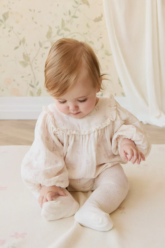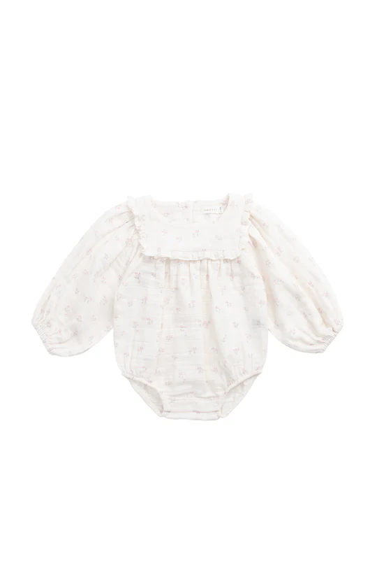A beautifully soft playsuit for your little love. The Frances Playsuit in Pauline Pink features a delicate floral pattern on a light blush muslin base, with long sleeves and a sweet ruffled collar. Designed for comfort and charm, it’s perfect for warm days or layered with tights and a cardigan when the weather cools.