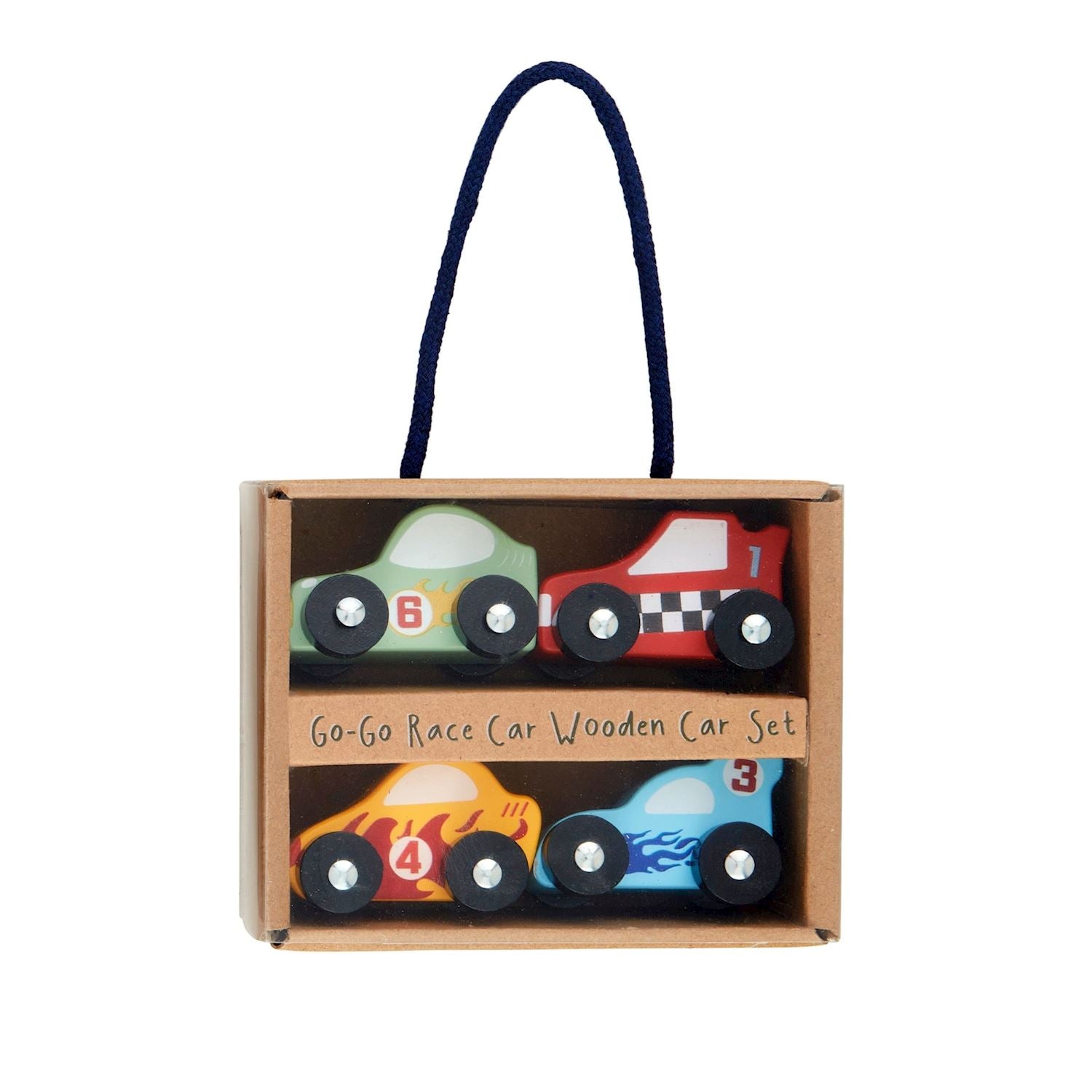 Set of four wooden mini vehicles come in kraft gift box with cotton rope top