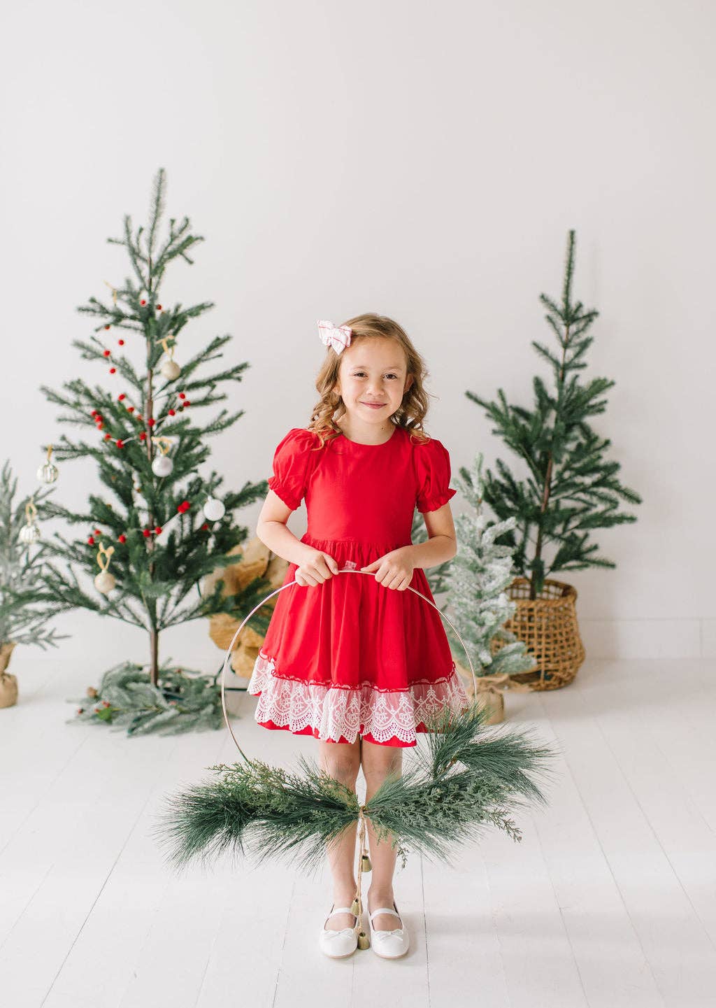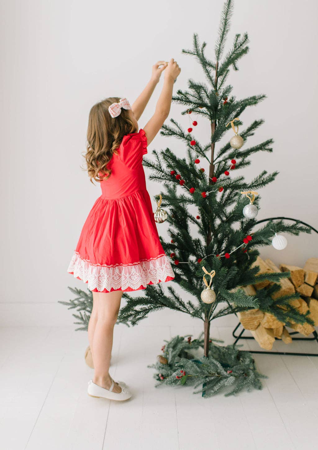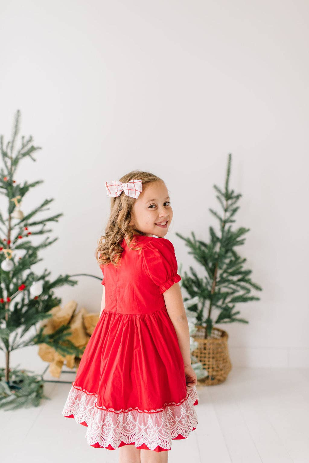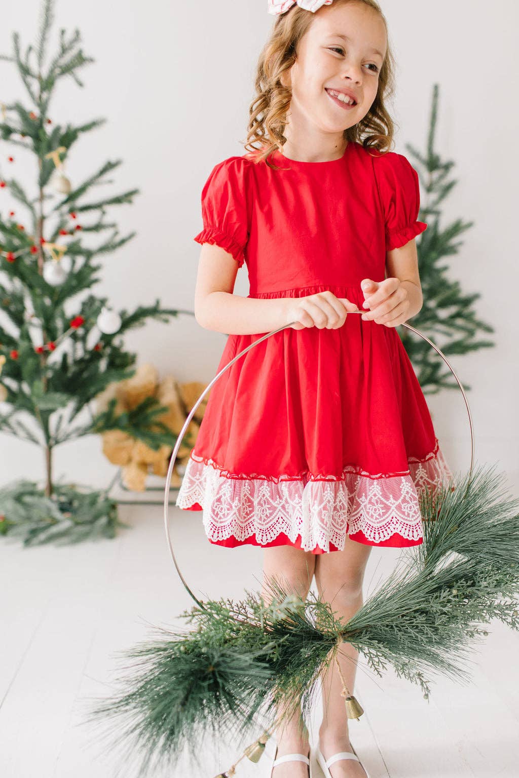 Our Aura Dress features a puffed short sleeve with a ruffled arm opening detail and a full skirt with trim and a sweet ruffle as well as a zippered back made of 100% poplin cotton with a cotton liner.