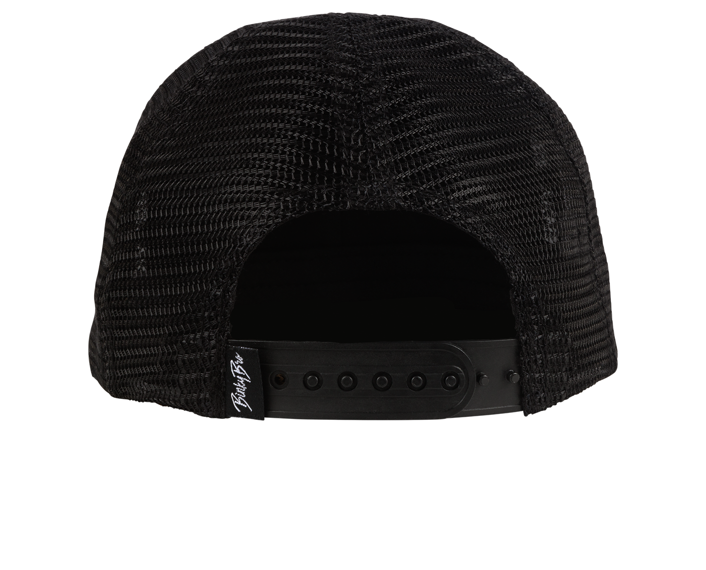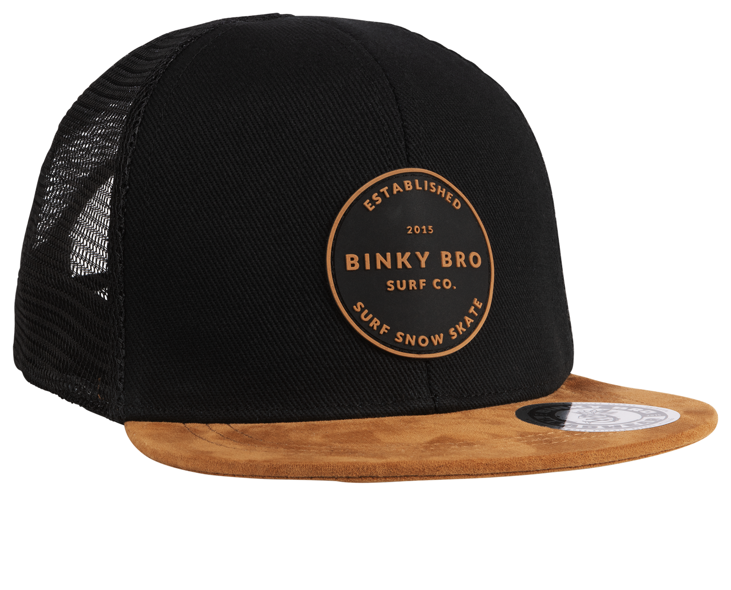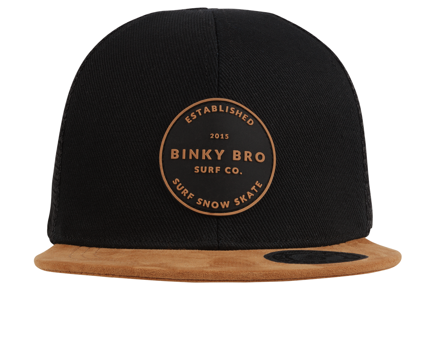 The Peniche snapback hat has all black paneling on front, black mesh on back, a brown suede bill, with an embossed black BinkyBro Surf Snow Skate patch on front. This hat is 60% polyester and 40% cotton.