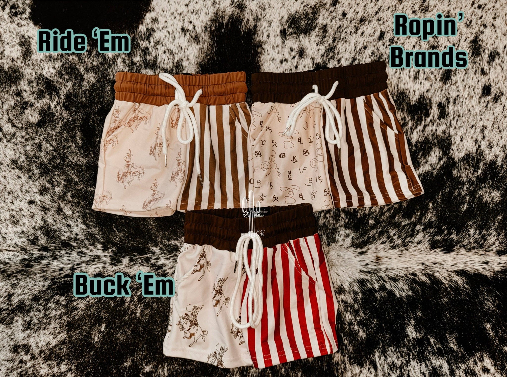 Saddle up, summers calling! Our Lil' Buckaroo rodeo swim trunks are made for the wildest little cowboys!