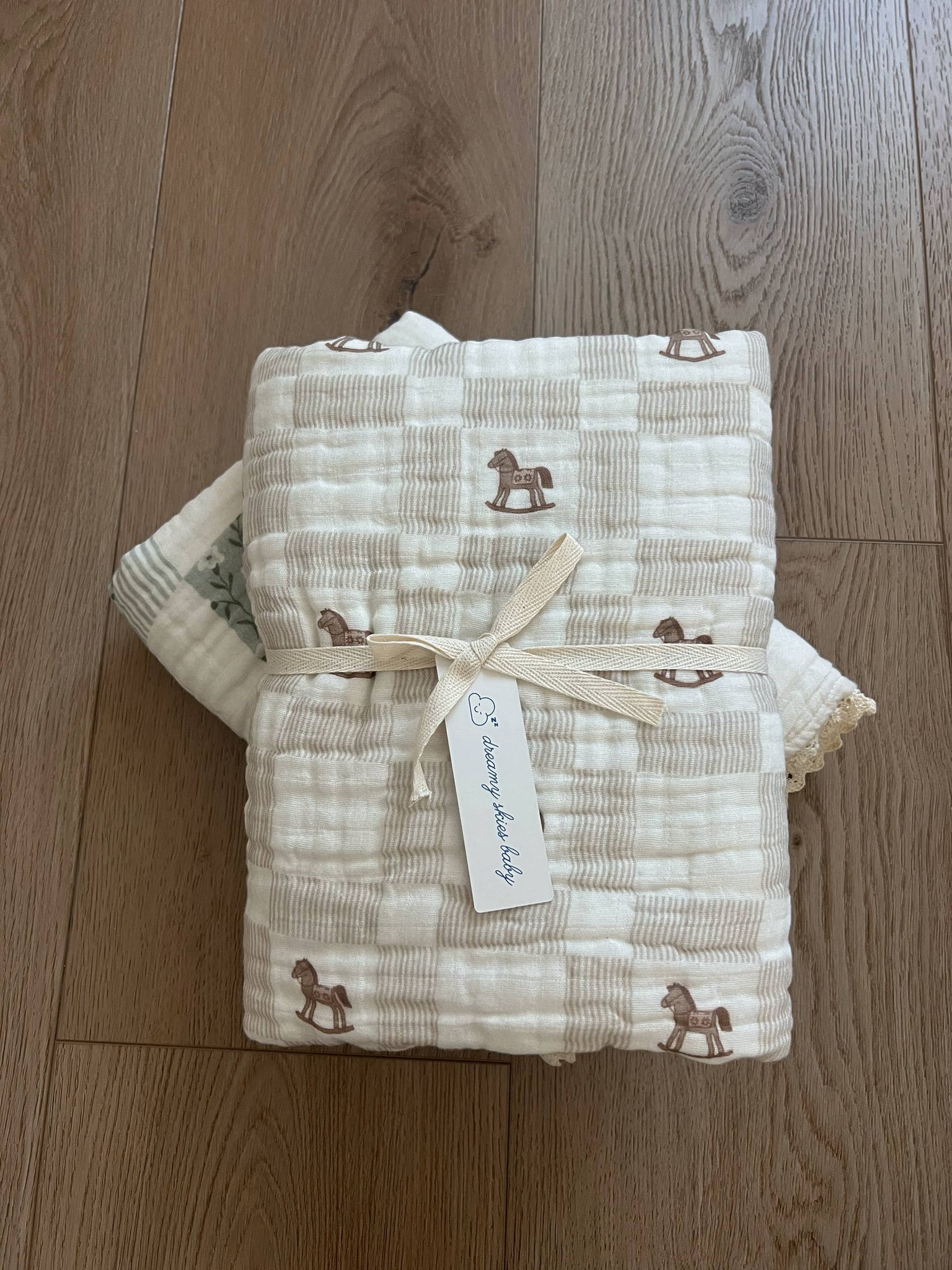 These 100% cotton blankets are made of a soft 6 layer gauze and has a plain edge trim - making it the perfect gender neutral blanket. They measure 42 x 42 inches making them the perfect size to grow with your little at every stage!