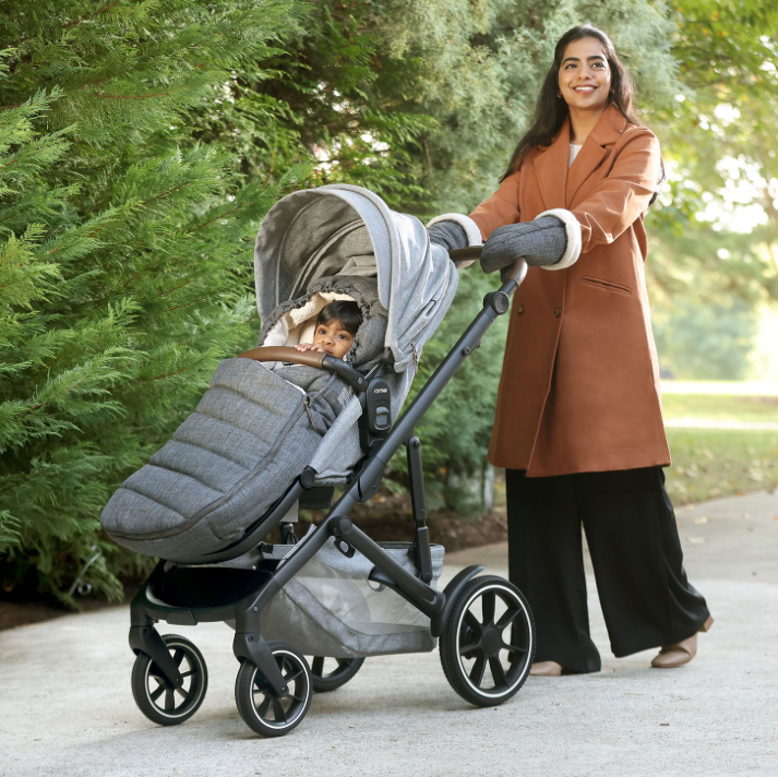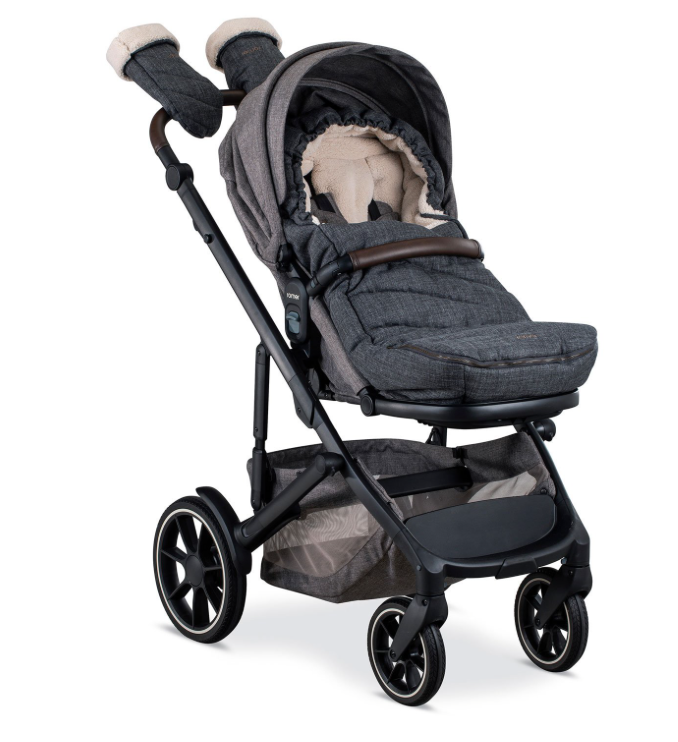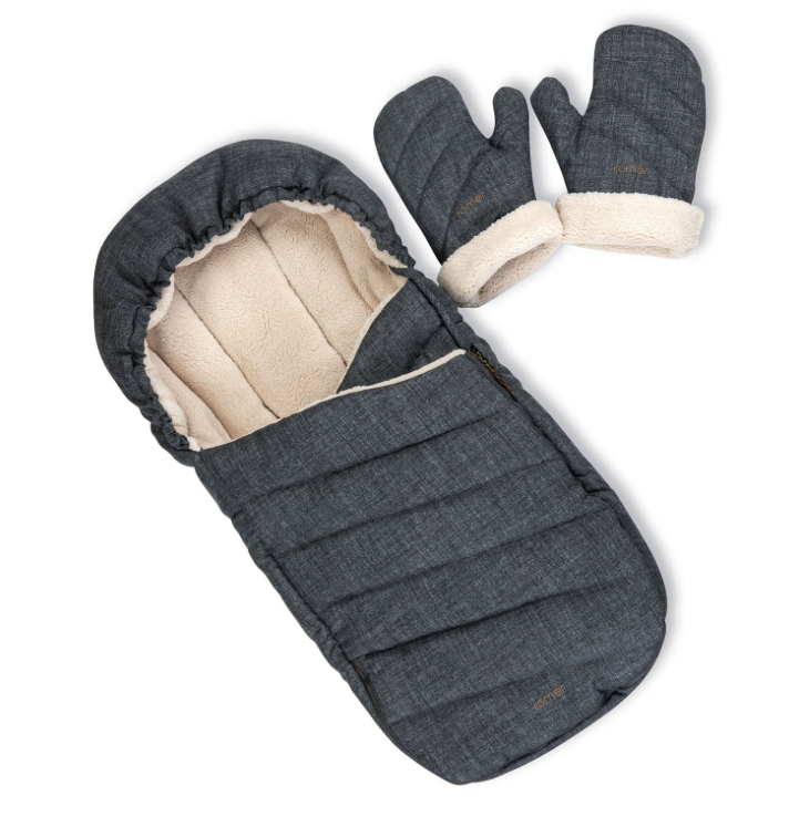 The Romer® Winter Kit offers the ultimate blend of comfort and style for a refined strolling experience. The insulating footmuff helps keep your little one bundled up and cozy, while the mittens help keep your hands nice and warm. Designed to match the Tura™ stroller, the footmuff and mittens are crafted with subtle elegance and luxurious fabrics. Both accessories feature a stylish and water-resistant outer layer made from recycled materials, plush inner padding, and a soft sherpa interior layer for coziness and warmth. The footmuff attaches easily to your Tura stroller with fabric loops, and the mittens have built-in magnets to keep them in place on the stroller handle. The footmuff and mittens are both safe to machine wash and dry for simplified cleaning.